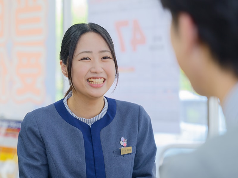 私の場合は、知識が定着してない状態でお客様の前に出るのが不安だったというのもあるので、その前に実践形式でロープレをしてもらったり、先輩スタッフの対応の後ろにつかせてもらいました。最初は見て覚えてからどんどん自分でお客様対応に入っていくという段階を踏んで接客ができたので、すごい安心できる育成環境でした。