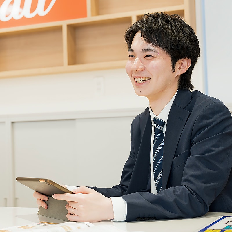 元々、人と接する仕事がいいと思っていて、販売や営業の仕事を中心に見ていました。就職活動を進めていく中で、学校からうちの会社について教えてもらい、携帯ショップの販売員は楽しそうだなと思って興味を持ちました。